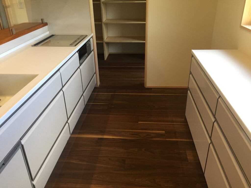 パントリーを設置した使いやすいキッチン。欅の一枚板を使ったキッチンカウンターは美しい仕上がりになっています。